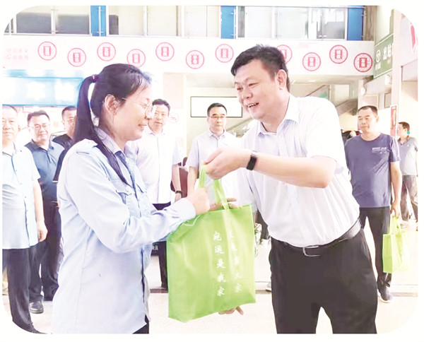 7月30日上午,集團(tuán)公司領(lǐng)導(dǎo)華磊、周克、韓永慶到南陽汽車站,看望慰問暑期伏天奮戰(zhàn)在客運(yùn)工作一線的廣大職工。同時(shí)在這里舉行“夏送清涼”活動(dòng)儀式,由各基層單位組織,向集團(tuán)公司全體職工送上慰問信,發(fā)放綠豆、白糖、霍香正氣水、夏桑菊、毛巾、風(fēng)油精等防暑降溫物品。客運(yùn)公司機(jī)關(guān)、南陽汽車站、一分公司、定制客運(yùn)公司班子成員和員工代表參加。